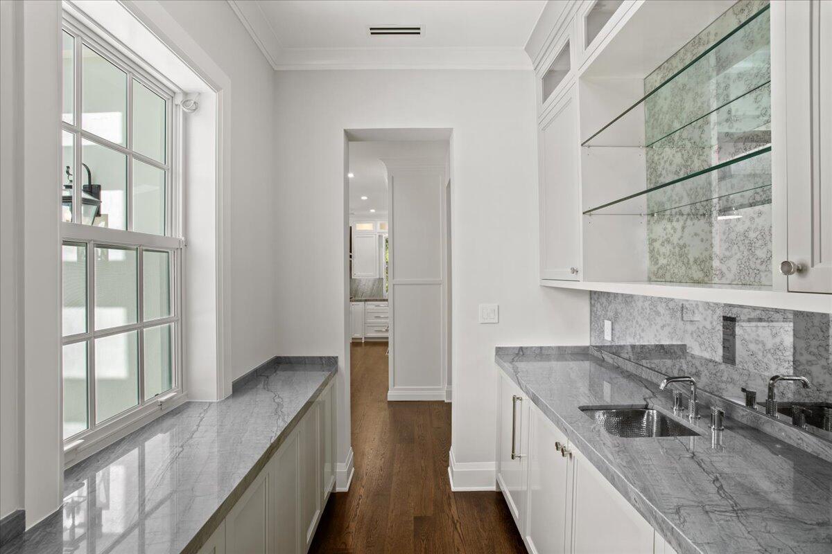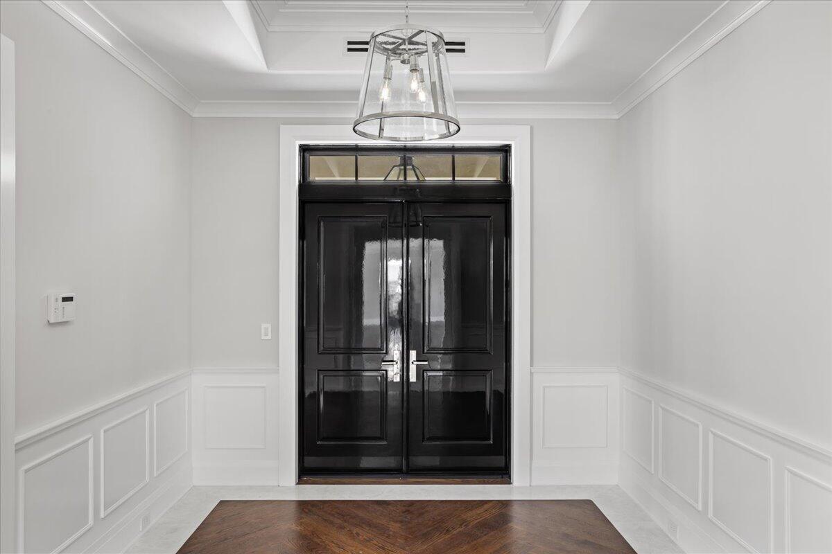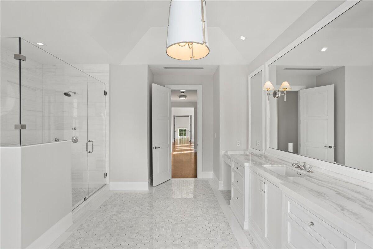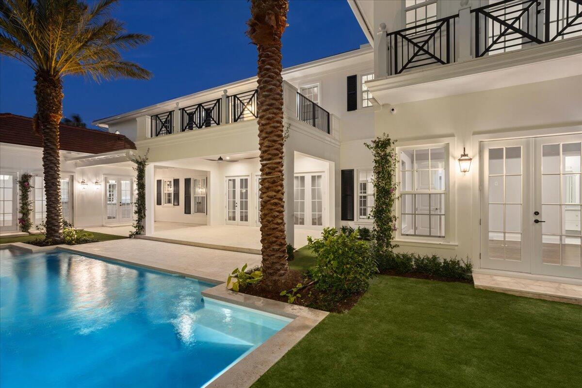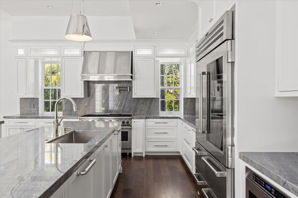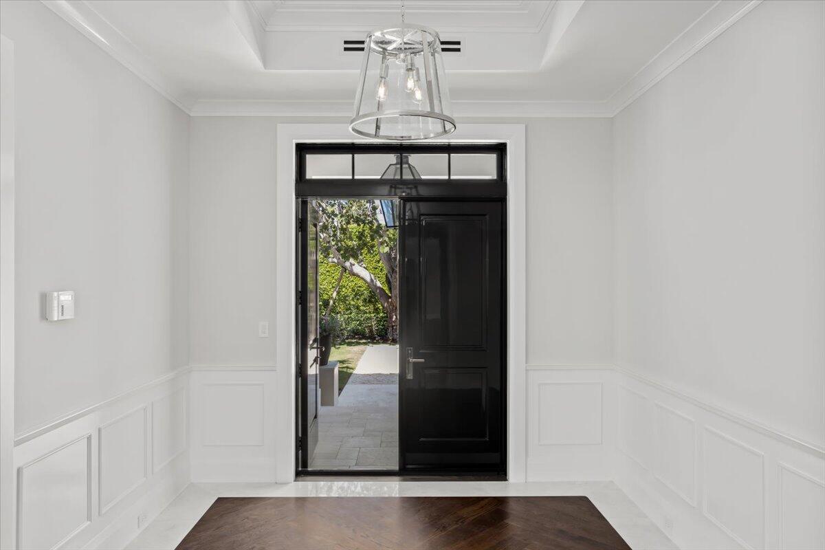 Just completed on an oversized lot, this five bedroom, 6.1 marble bath estate has ultra-high ceilings and spacious rooms throughout. A stately entry foyer, separate bar with 2 refrigerators, hardwood floors and recessed lighting throughout. Bright and light, every room has at least two walls of windows/doors. The primary suite has two luxurious bathrooms, large walk-in closets, and a generous private terrace. The kitchen has quality cabinetry and appliances and expands onto a spacious family room. The east side of the property has a wonderfully sized garden area, and the west aide has an outdoor loggia that is adjacent to the oversized pool/spa. Additionally, there is an elevator, storage, 2 laundry rooms, air-conditioned two car garage,