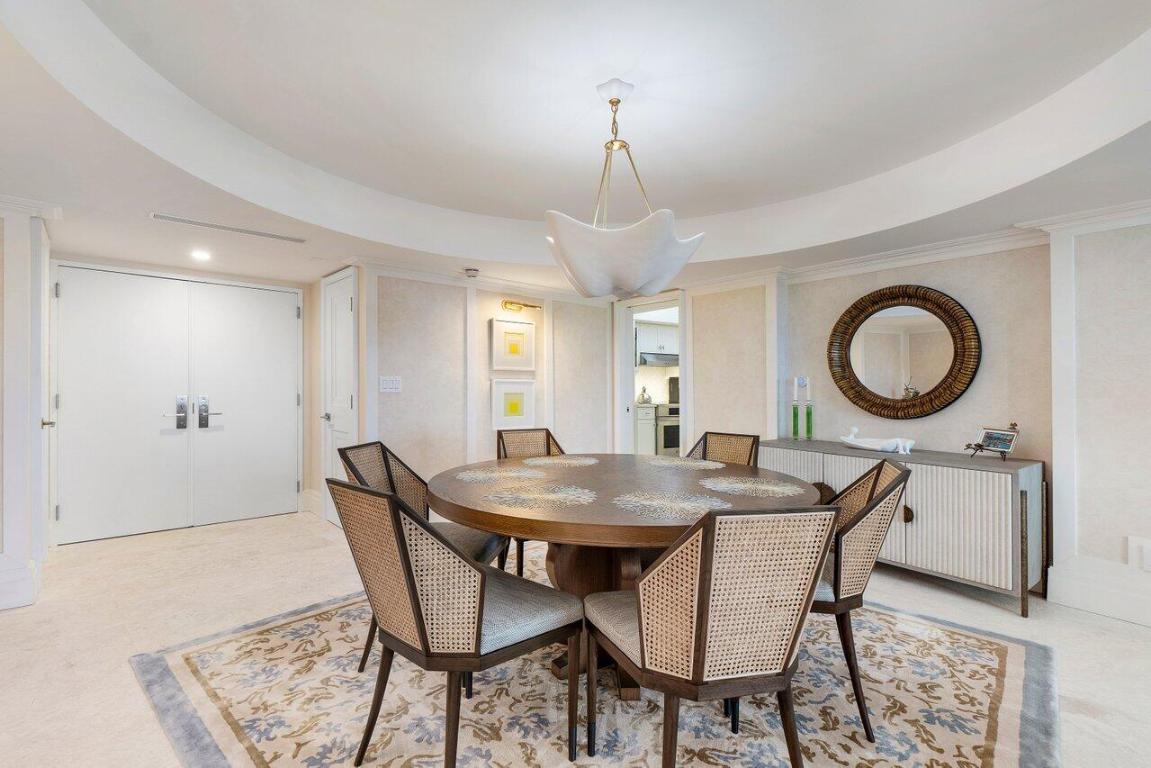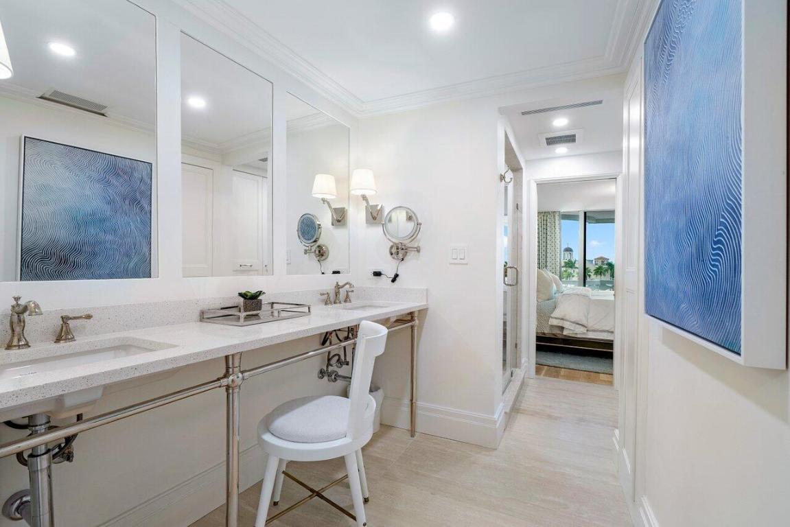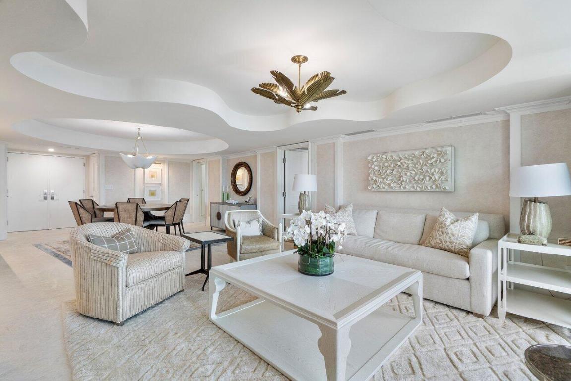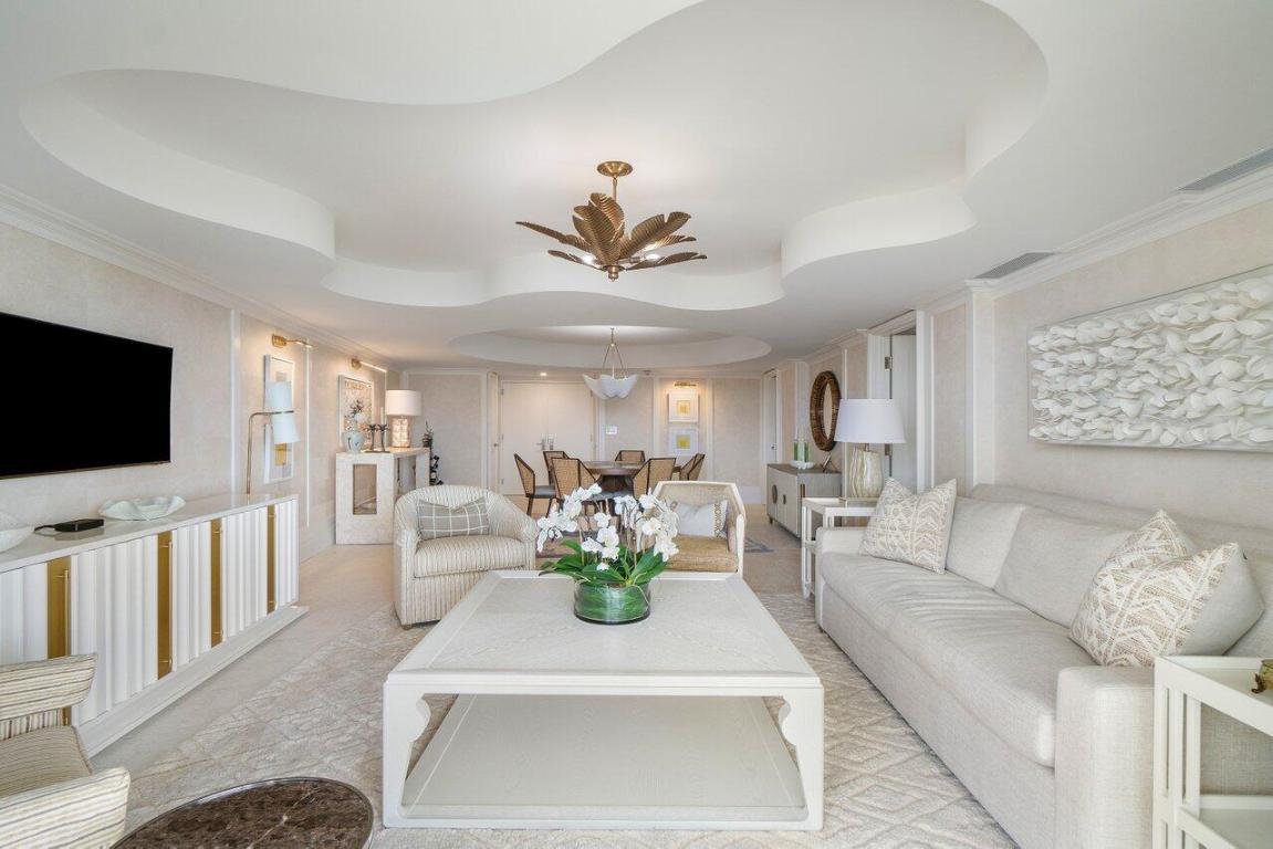 Expertly renovated by award-winning designer James Michael Howard, this high-end, generously proportioned, 1-bedroom, 1.5-bathroom condo sits gracefully on the 6th floor, boasting expansive, breezy panoramic vistas of the city within one of Palm Beach's most sought-after full-service residential buildings, Sun & Surf, making it an ideal choice. The modern interiors showcase exquisite craftsmanship, featuring custom millwork gracing every corner, elegant limestone and white oak floors throughout and linear diffused AC. A herringbone porcelain tile backsplash adds a touch of sophistication to the quartzite kitchen and is equipped with high-end appliances, perfect for culinary enthusiasts. Both bathrooms are adorned with luxurious terrazzo countertops, while the primary bathroom includes dual sinks along with a soaking tub and a separate shower. The impact windows and doors not only provide security but also enhance the sleek design. Offering a prime location and a host of superior resort amenities, residents can enjoy access to a state-of-the-art gym, pool with dedicated attendants, private beach access, convenient valet parking, attentive concierge services, and the added allure of a recently revamped lobby and common areas. Only for the discerning.