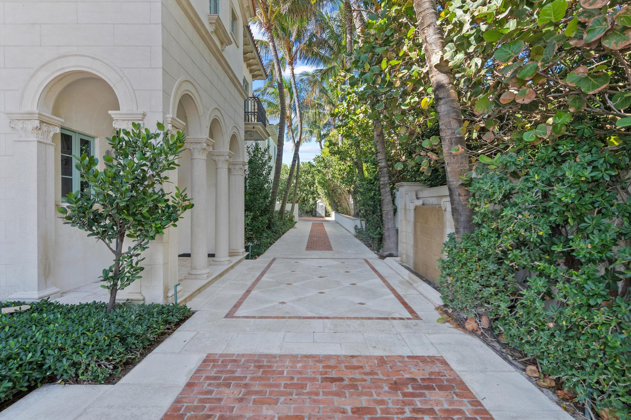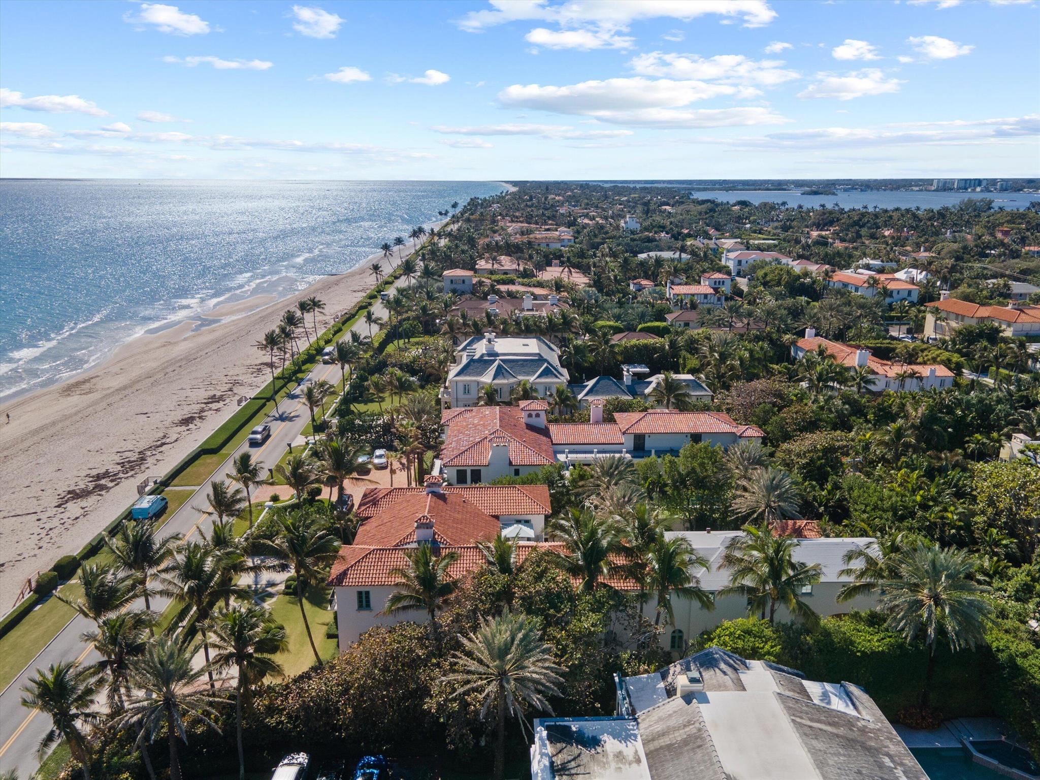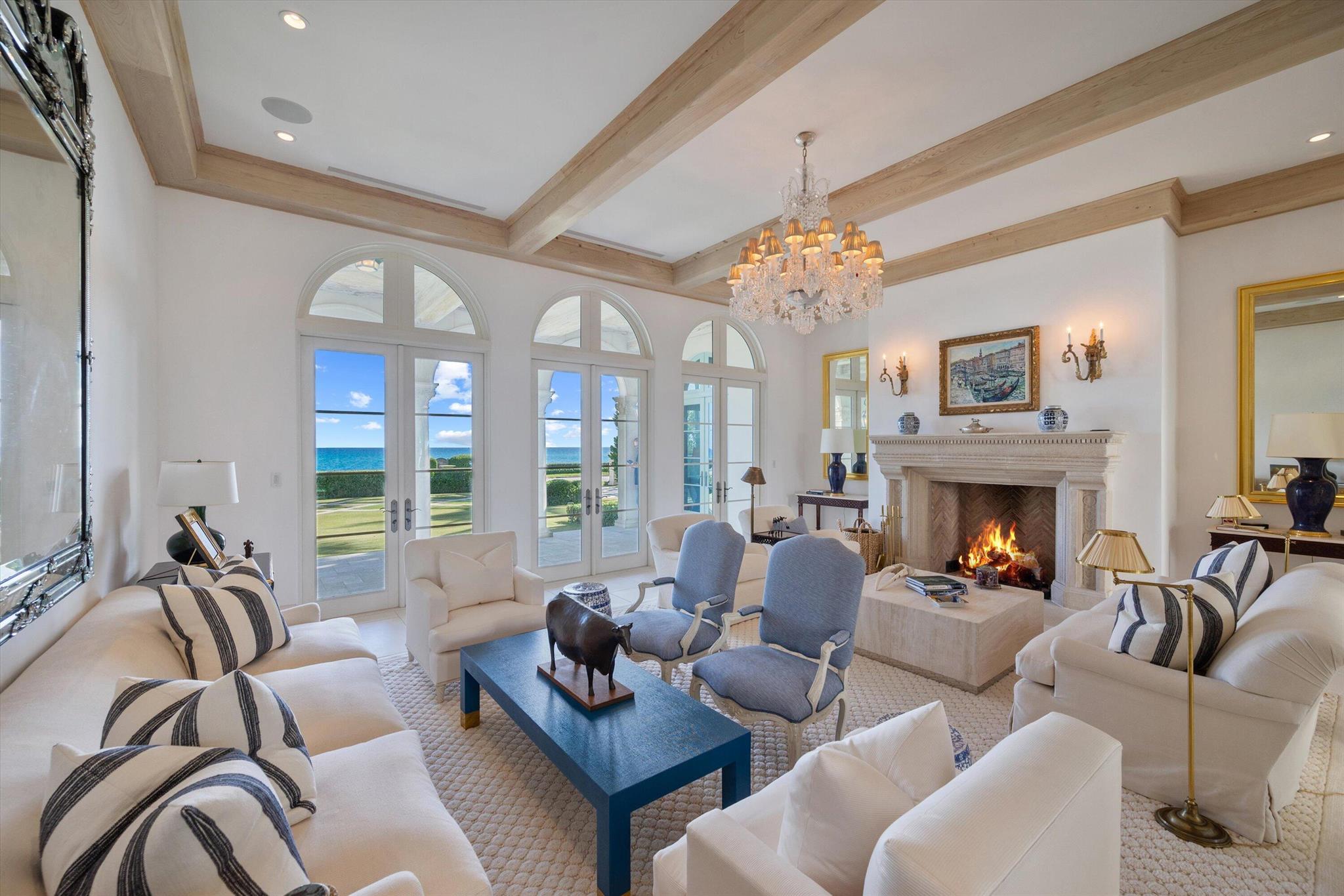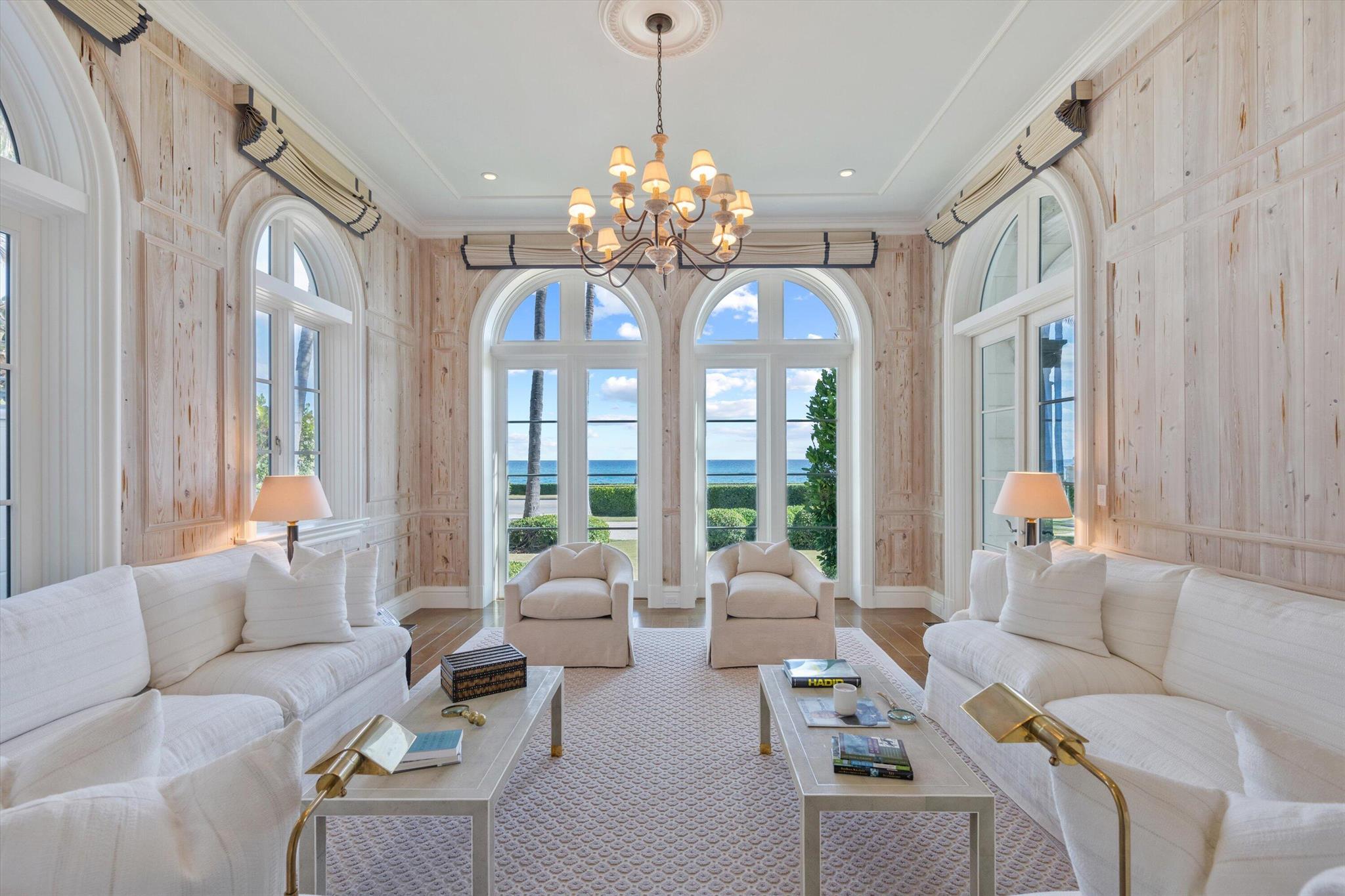 This luxurious Mediterranean oceanfront seven-bedroom estate has been beautifully renovated and is set on over half an acre offering stunning water views with a wealth of amenities for effortless coastal living. Curated by AD 100 designer Daniel Romualdez for gracious entertaining, it features an ocean-view living room with a gas fireplace, a club room with a full bar, a paneled oceanfront library, a day oceanfront living room, a formal dining room, a wood beamed entertainment room, and a gourmet chef's eat-in kitchen with a marble island, high end appliances, and a butler's pantry. Beachside enjoyment is elevated with covered loggias overlooking both the ocean and the pool, an expansive heated pool with a built-in spa, a cabana with a bath, and a shaded patio for poolside dining.
