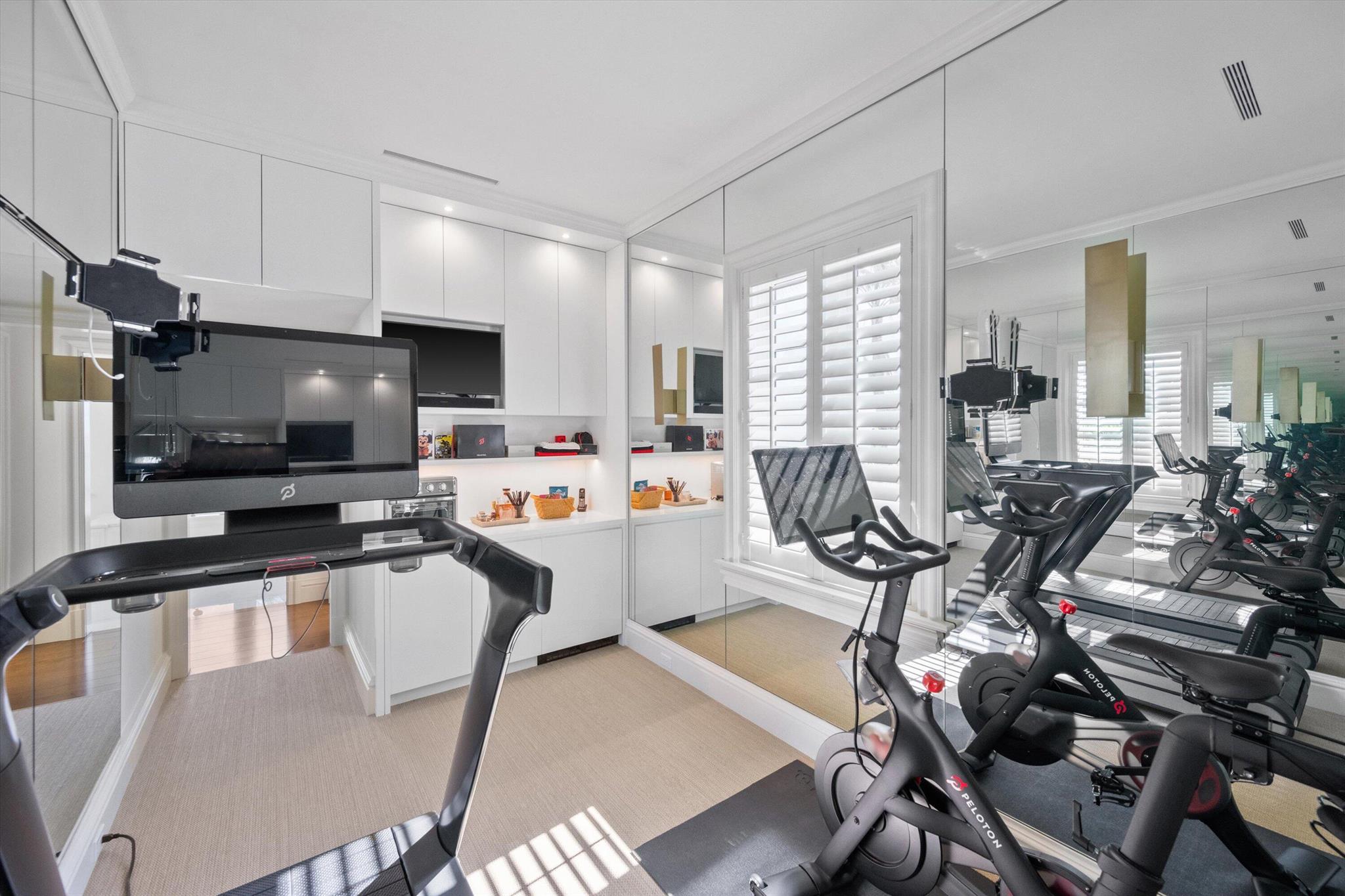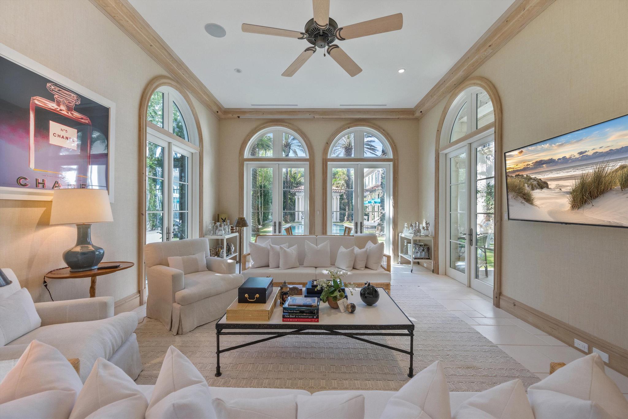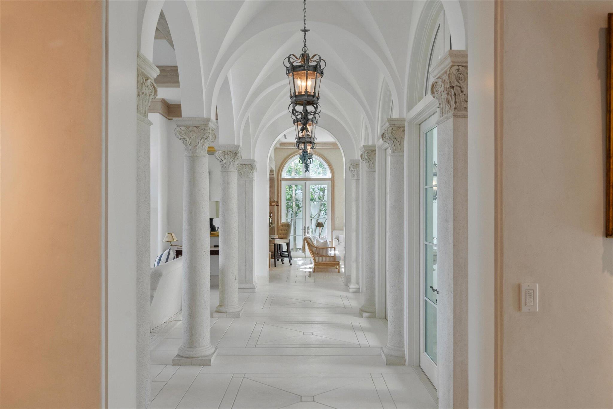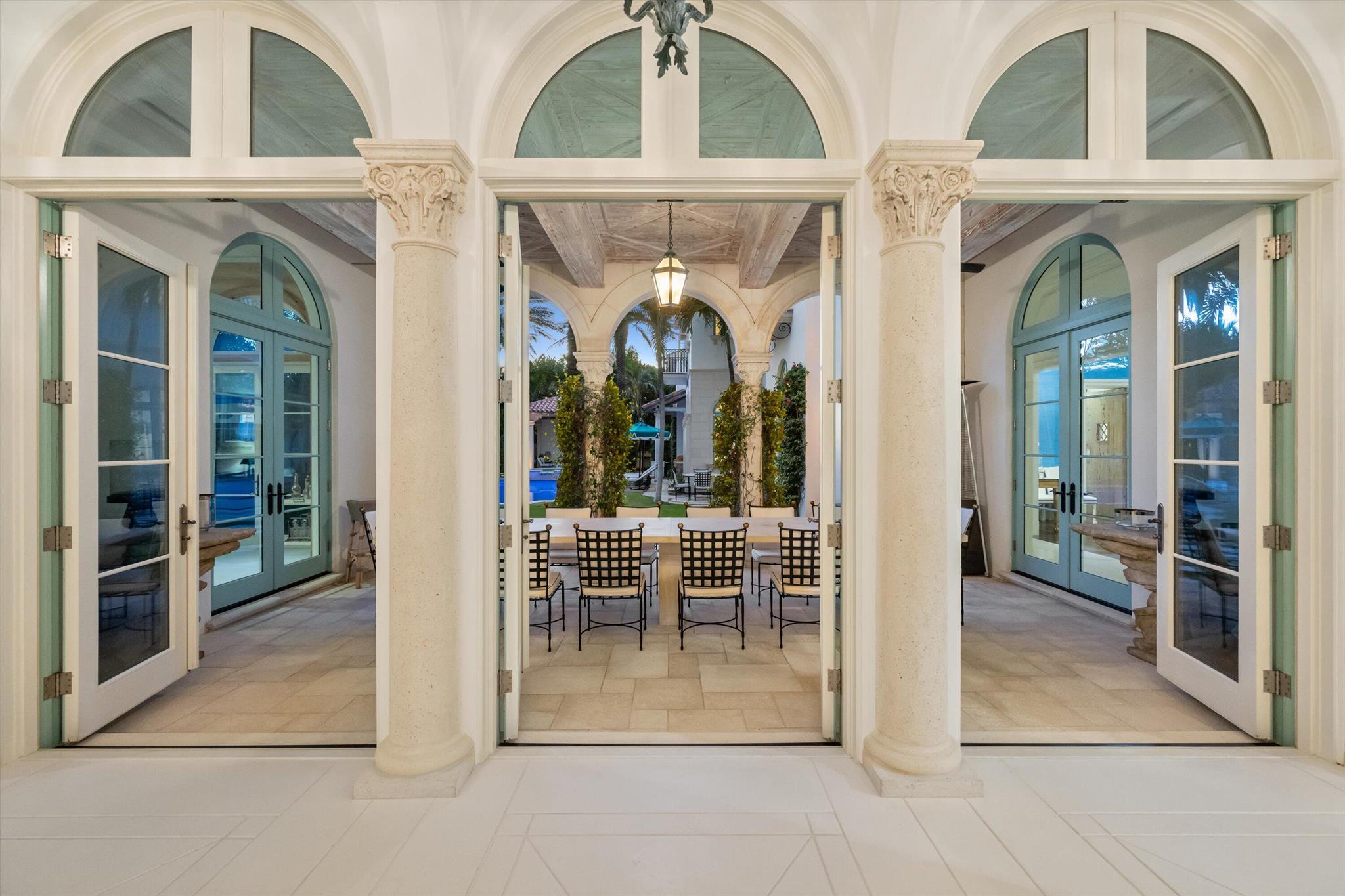 This luxurious Mediterranean oceanfront seven-bedroom estate has been beautifully renovated and is set on over half an acre offering stunning water views with a wealth of amenities for effortless coastal living. Curated by AD 100 designer Daniel Romualdez for gracious entertaining, it features an ocean-view living room with a gas fireplace, a club room with a full bar, a paneled oceanfront library, a day oceanfront living room, a formal dining room, a wood beamed entertainment room, and a gourmet chef's eat-in kitchen with a marble island, high end appliances, and a butler's pantry. Beachside enjoyment is elevated with covered loggias overlooking both the ocean and the pool, an expansive heated pool with a built-in spa, a cabana with a bath, and a shaded patio for poolside dining.